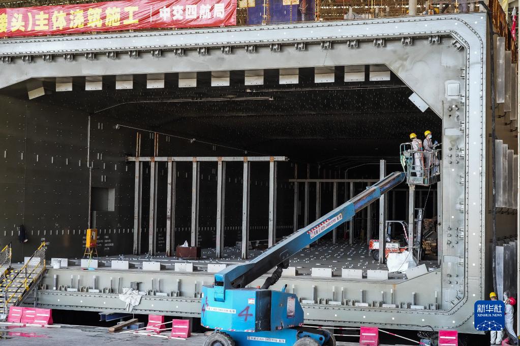 在中交四航局珠海牛頭島沉管智慧工廠(chǎng),施工人員為深中通道海底隧道最后一個(gè)管節(非標準管節、含最終接頭)一次舾裝做準備工作(1月30日攝)。