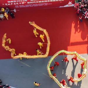 1月31日,在湖南省衡陽(yáng)市珠暉區東風(fēng)街道前進(jìn)里社區,人們舞龍舞獅迎接元宵節的到來(lái)(無(wú)人機照片)。