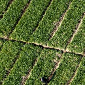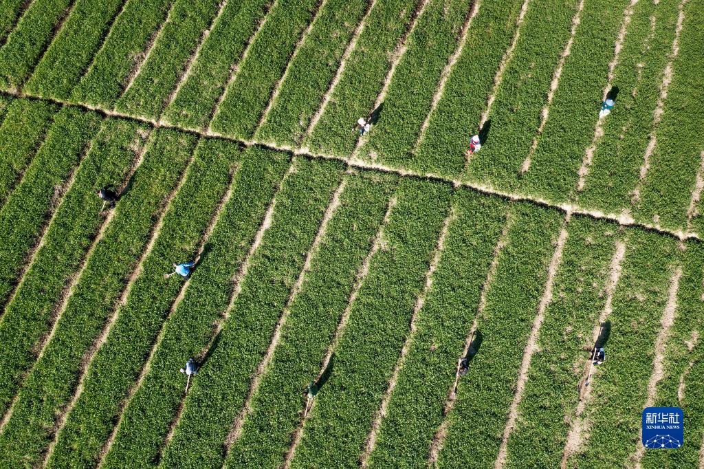1月31日,村民在浙江省諸暨市同山鎮綠劍村的田間護理小麥(無(wú)人機照片)。