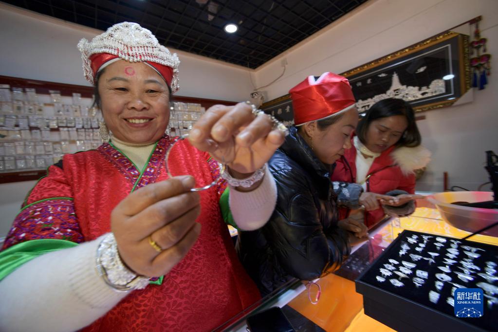 2月1日,游客在舊州古鎮一家銀飾店選購銀飾。