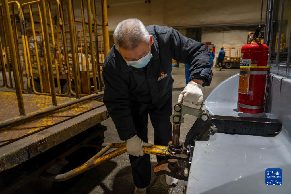 在南昌火車(chē)站,牽引車(chē)司機張細茂將斗車(chē)掛在牽引車(chē)上(2月1日攝)。