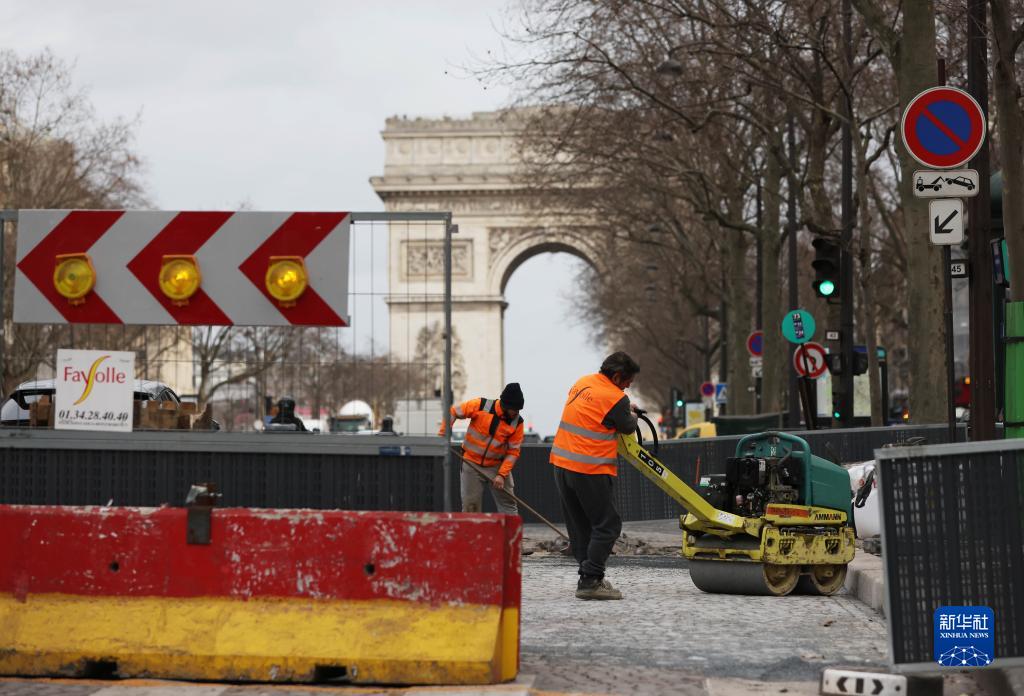2月1日,工人在法國巴黎凱旋門(mén)附近修路。