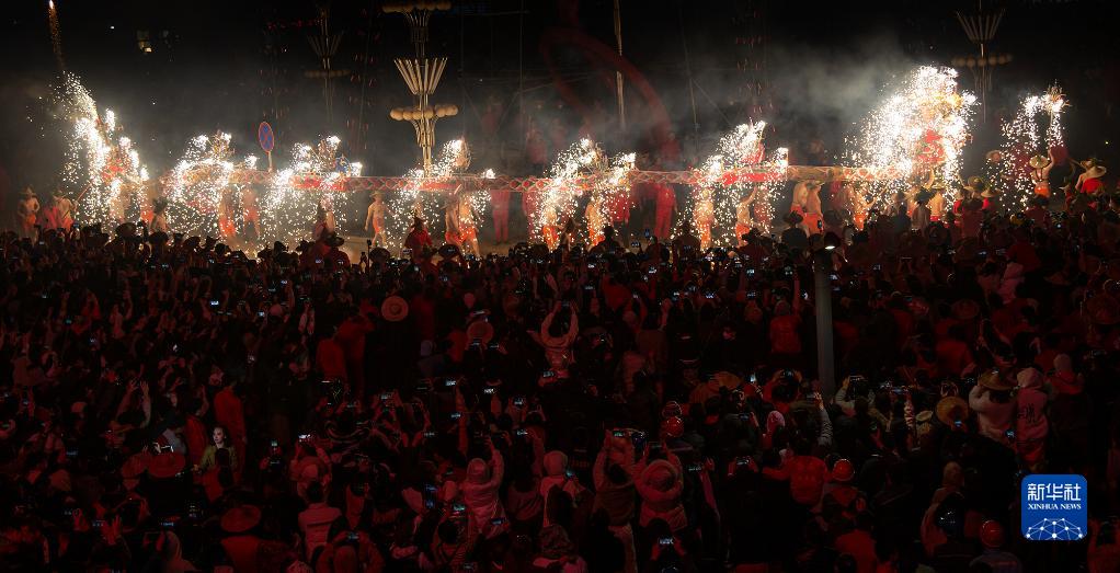 1月31日晚,民間藝人在廣東省揭陽(yáng)市揭東區磐東街道表演國家級非物質(zhì)文化遺產(chǎn)——喬林煙花火龍,吸引大量市民游客。