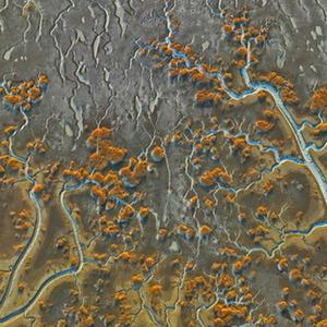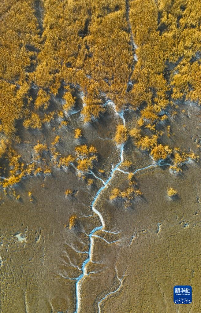 近日,在遼寧盤(pán)錦遼河口濕地,海水在潮汐作用下涌入遼河口濕地的潮溝,并凝結成冰,從高空看去,宛若蜿蜒曲折、形態(tài)各異的“冰脈”。