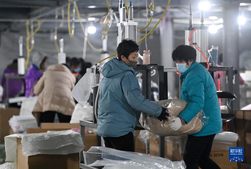 在天津市武清區崔黃口鎮安芝金林地毯有限公司,工人搬運材料(2月1日攝)。