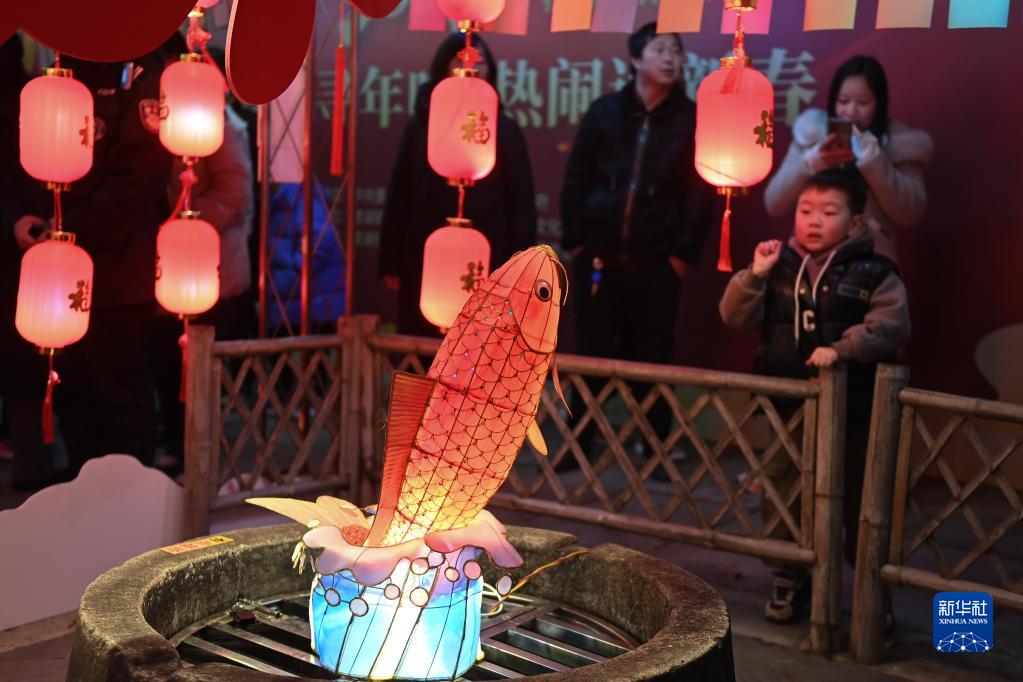 2月2日,小朋友在浙江省湖州市南潯區菱湖鎮在古鎮景區觀(guān)賞具有當地文化特色的魚(yú)燈。