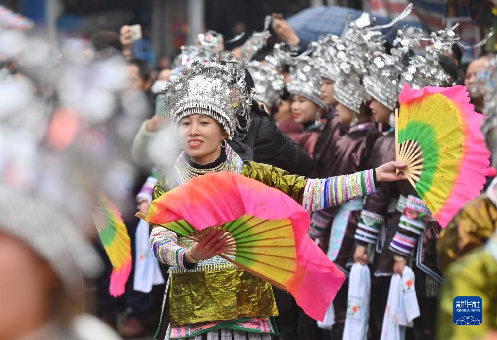 2月2日,融水苗族自治縣桿洞鄉苗族姑娘在跳苗舞。