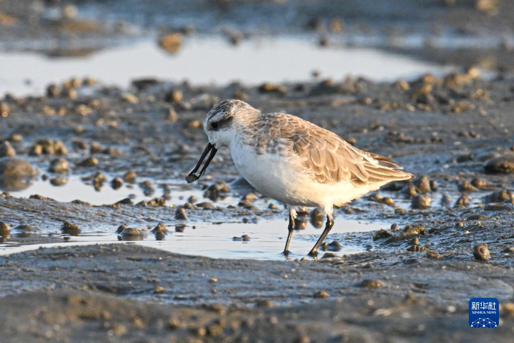 世界珍稀鳥(niǎo)類(lèi)勺嘴鷸在海南儋州灣濕地覓食(2022年12月11日攝)。