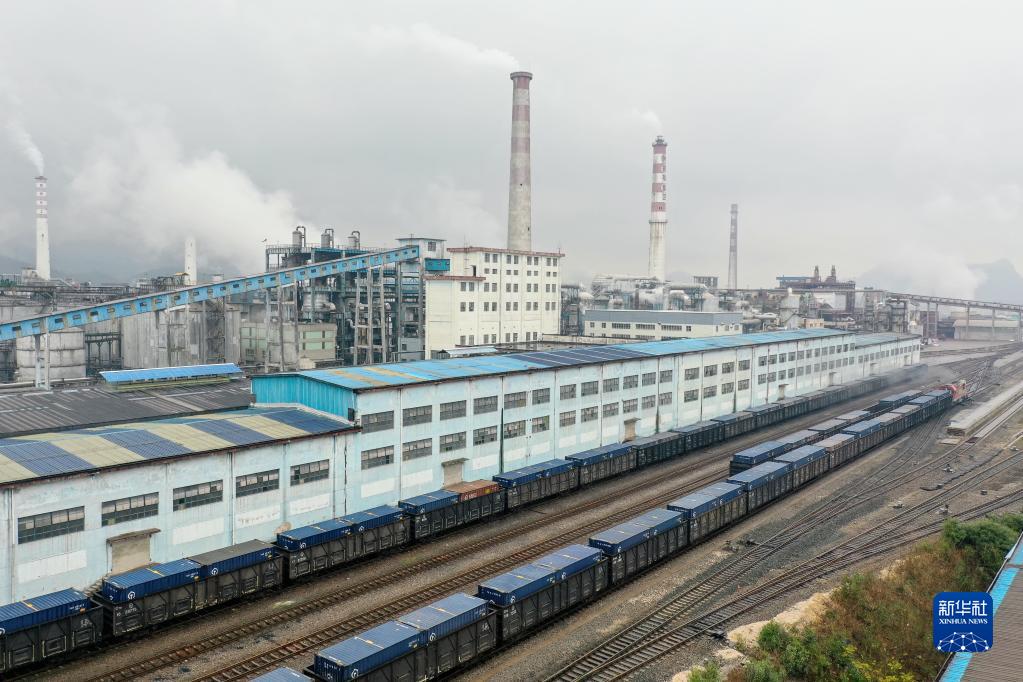 這是2月2日拍攝的裝載化肥的貨運列車(chē)與福泉市甕?;す荆o(wú)人機照片)。