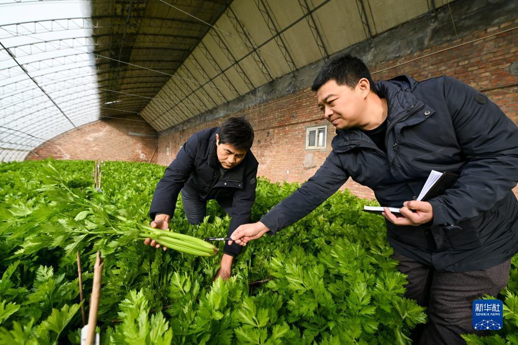 2月2日,研究員高國訓(左)與副研究員吳鋒在天津市農業(yè)科學(xué)院創(chuàng )新基地查看記錄芹菜雜交試驗種生長(cháng)情況。