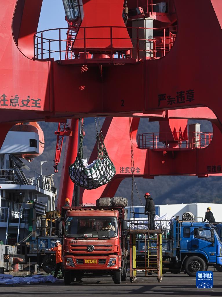 工人在舟山遠洋漁業(yè)基地的碼頭上卸貨(1月31日攝)。舟山遠洋漁業(yè)基地2022年遠洋自捕魚(yú)進(jìn)關(guān)量達62萬(wàn)噸,2016-2022年累計近278萬(wàn)噸。