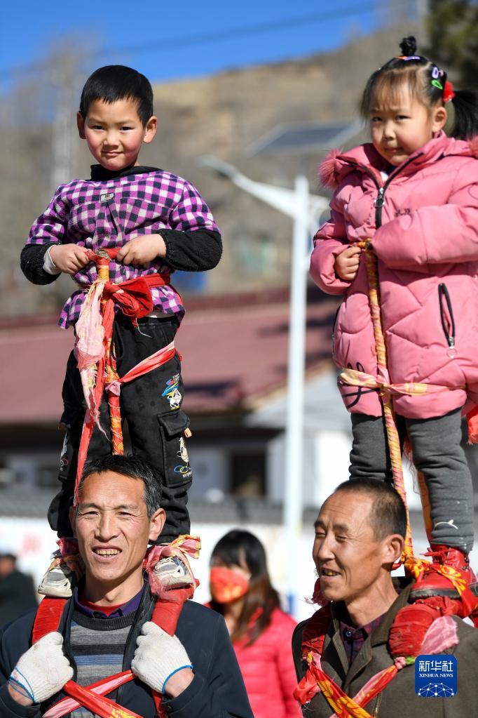2月3日,寧夏固原市隆德縣觀(guān)莊鄉陽(yáng)洼村村民在排練扛社火??干缁鹗怯缮韽娏训某赡昴凶蛹缈钙鹉挲g較小的孩子,扮演成各種不同的戲曲人物,在行走中進(jìn)行表演,是社火演出的一種形式。