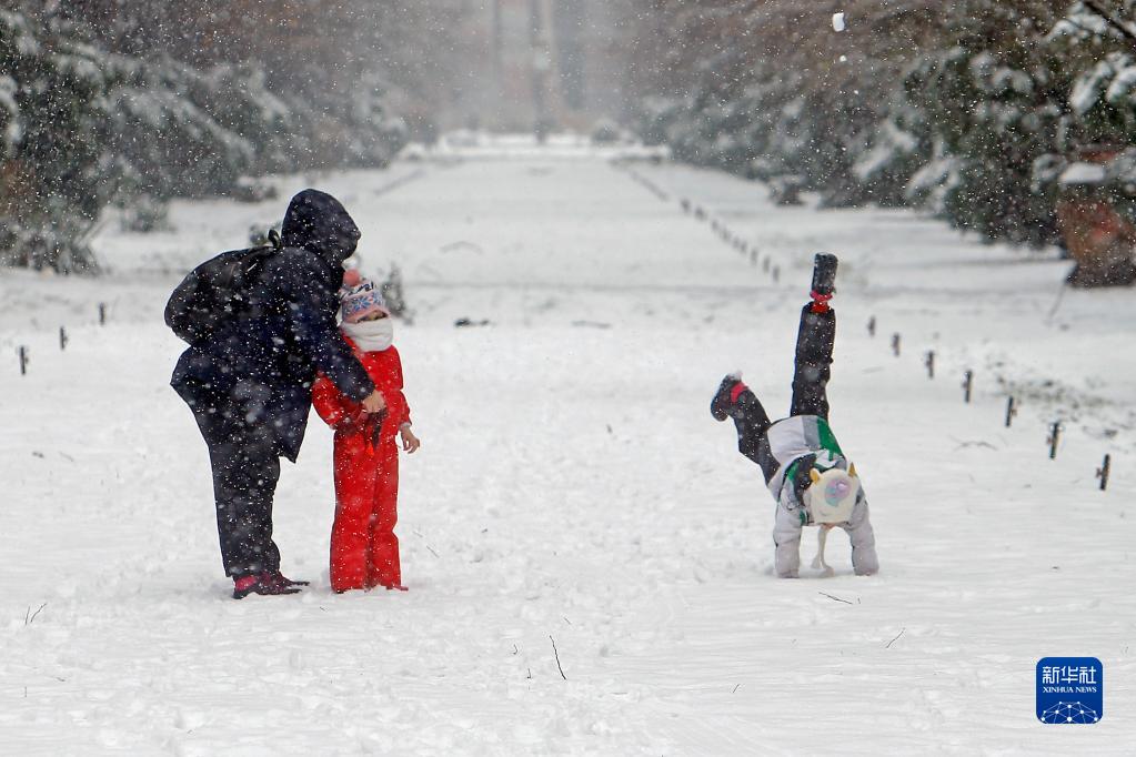 1月28日,人們在羅馬尼亞布加勒斯特一處公園的雪地上玩耍。
