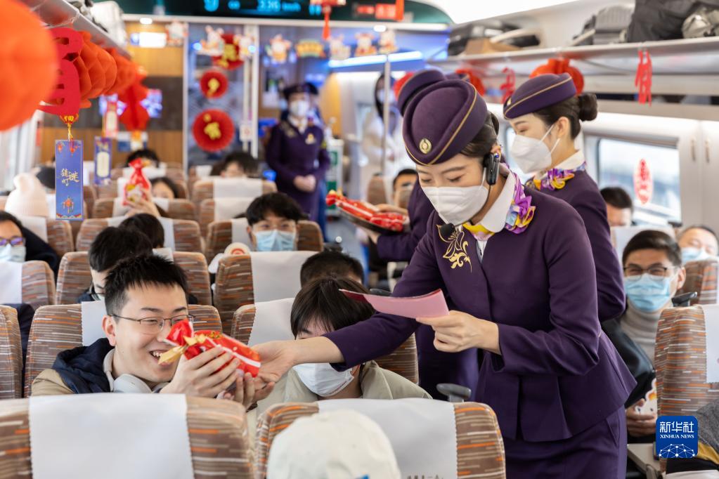 2月4日,鐵路上??瓦\段乘務(wù)人員在G8次列車(chē)上為猜燈謎的旅客送上小禮品。