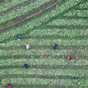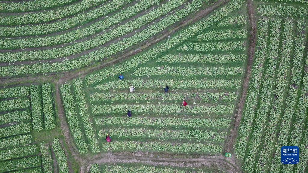 2月4日,菜農們在宜章縣天塘鎮一處蔬菜基地采收(無(wú)人機照片)。