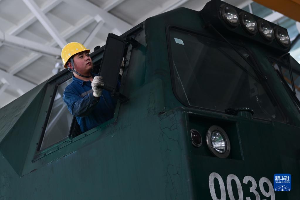 2月4日,在格爾木機務(wù)段檢修車(chē)間,馬國仁檢查機車(chē)后視鏡。