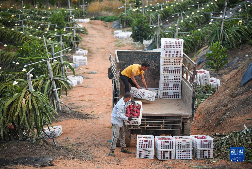 在海南省三亞市育才生態(tài)區“水果島”火龍果基地,人們將采收的火龍果裝車(chē)(2月1日攝)。