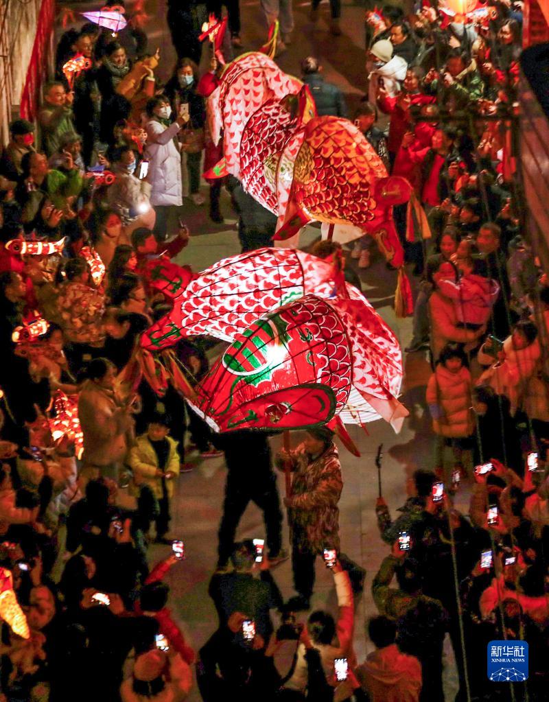 1月31日,在安徽省黃山市歙縣,瞻淇魚(yú)燈表演隊伍在嬉游祈福。