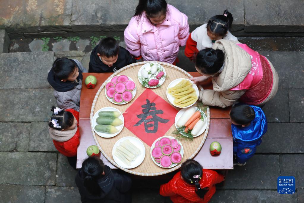 2月4日,在浙江省杭州市臨安區天目山鎮交口村文化禮堂,小朋友在學(xué)習立春“咬春”民俗知識。