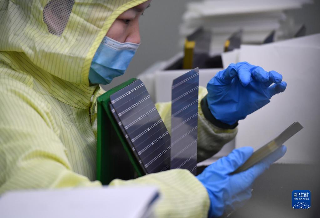 2月2日,檢驗人員在隆基綠能高陵電池工廠(chǎng)檢查電池片。
