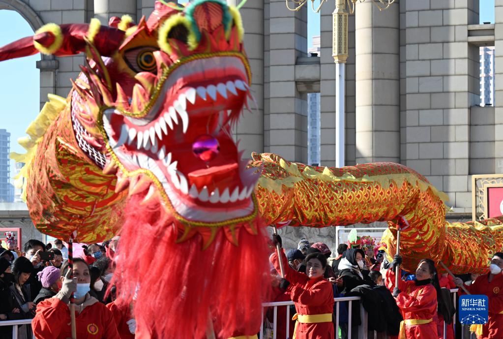 2月4日,舞龍舞獅表演隊在濱河廣場(chǎng)進(jìn)行展演。