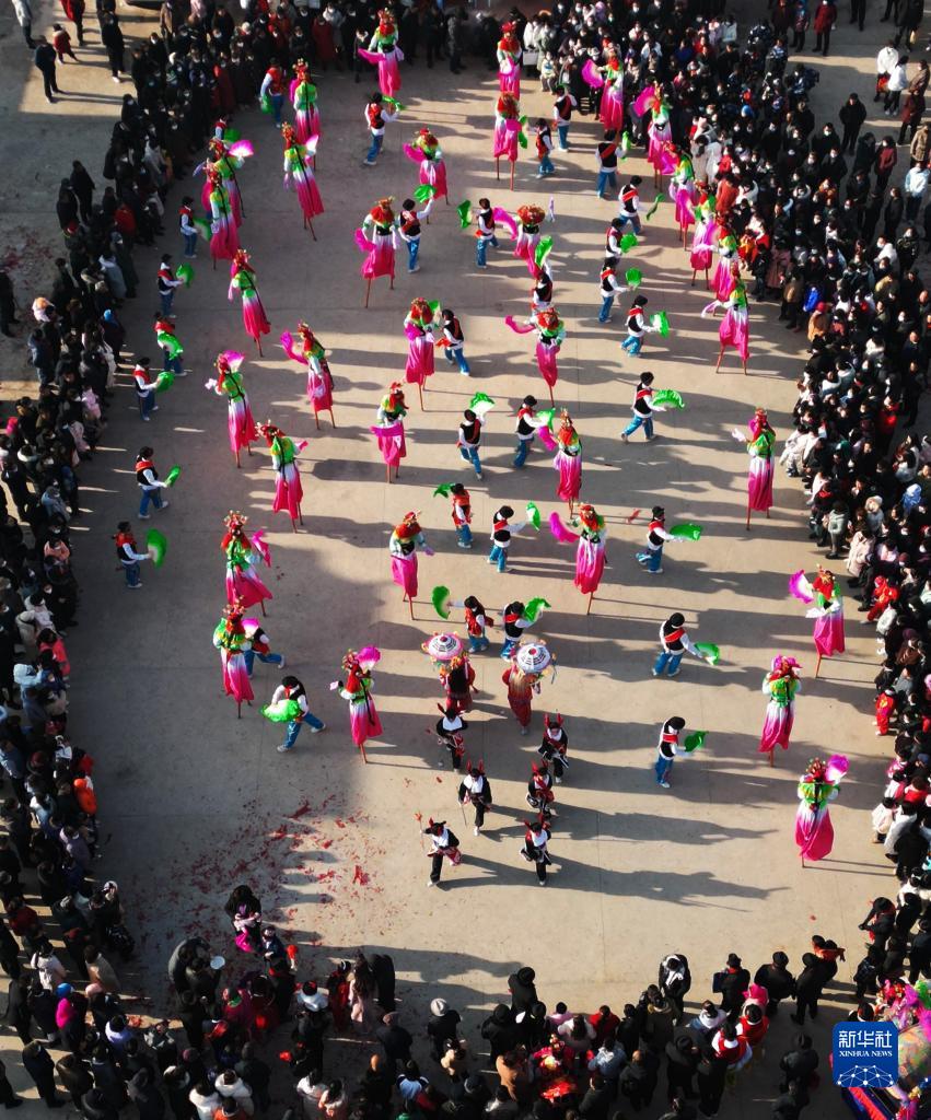 2月3日,甘肅省和政縣舉行秧歌匯演活動(dòng)。這是鄉村秧歌隊在和政縣街頭表演(無(wú)人機照片)。