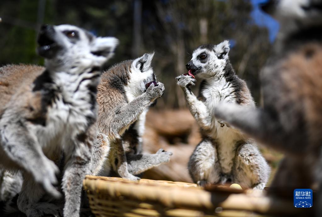 2月4日,云南野生動(dòng)物園的狐猴品嘗“元宵美食”。
