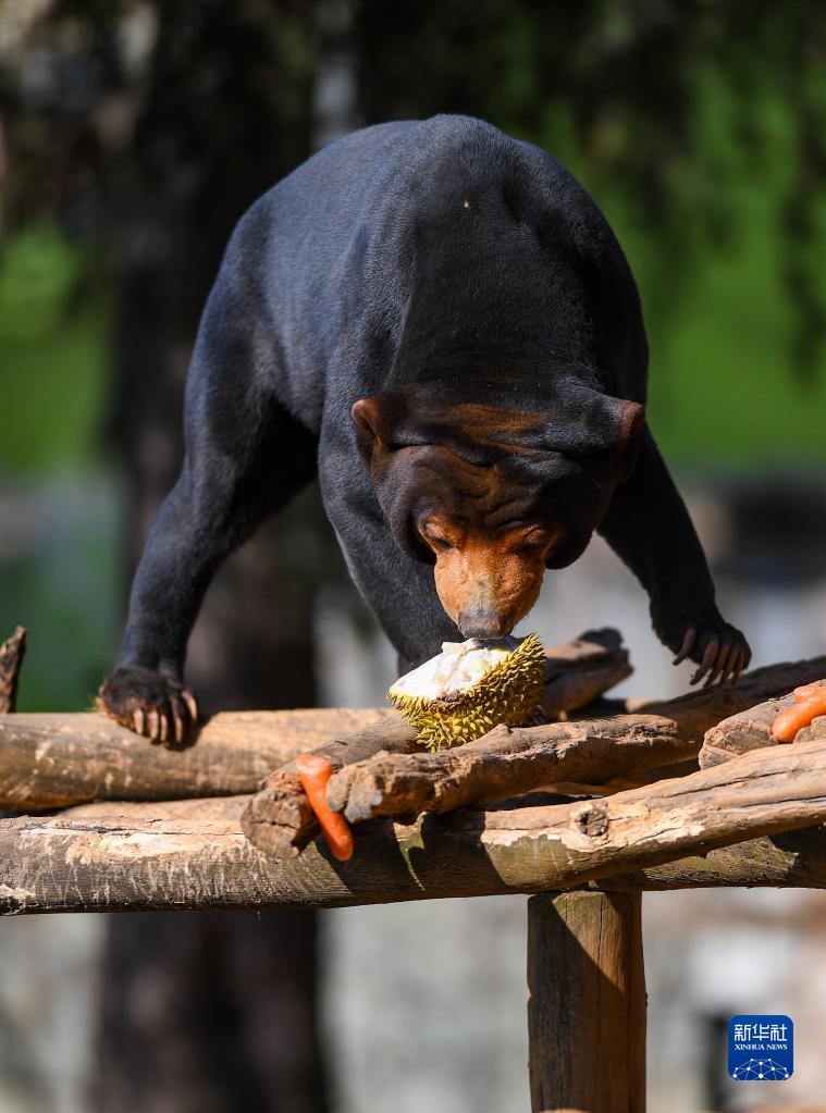 2月4日,云南野生動(dòng)物園的馬來(lái)熊品嘗榴蓮。