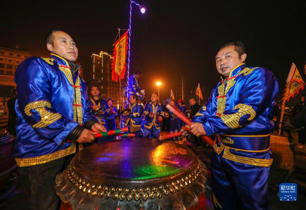 2月4日,人們在貴州省玉屏侗族自治縣舞陽(yáng)廣場(chǎng)敲擊鑼鼓。
