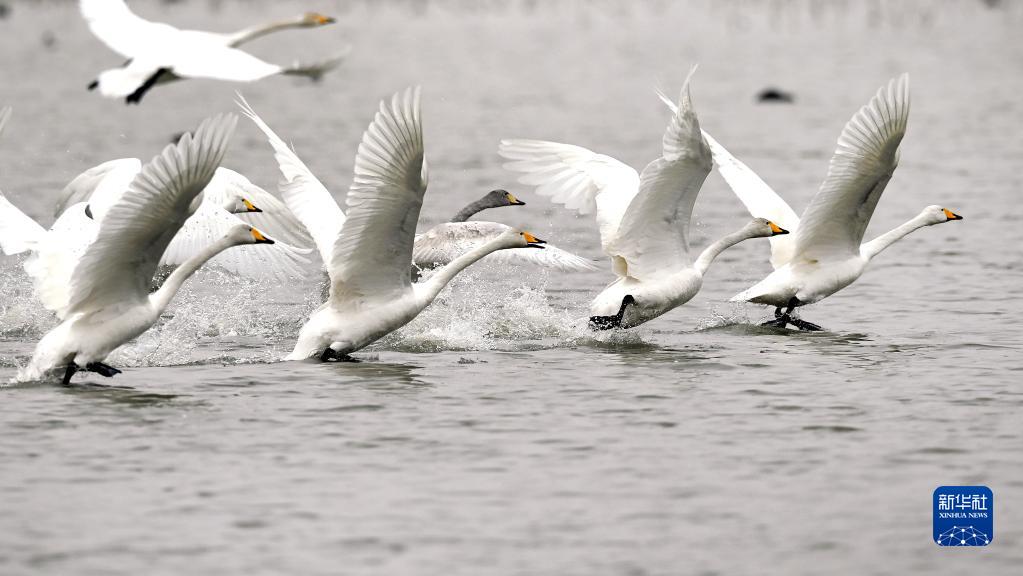 2月2日,黃河西岸的合陽(yáng)黃河濕地自然保護區內,天鵝展翅飛翔。