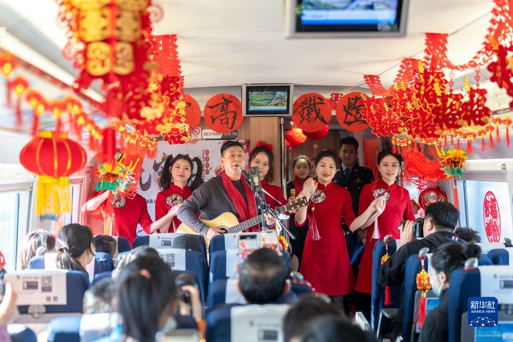 2月4日,沈陽(yáng)客運段列車(chē)工作人員為旅客表演節目。