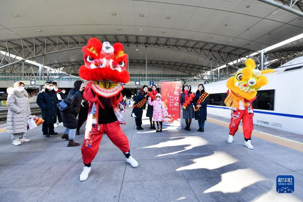 2月4日,沈陽(yáng)客運段列車(chē)工作人員為旅客準備了舞獅表演。