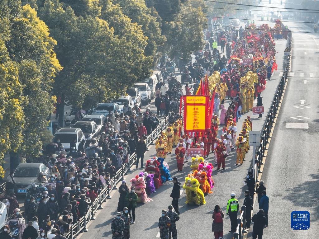 2月5日,民間藝人在江蘇省淮安市盱眙縣街頭巡游(無(wú)人機照片)。