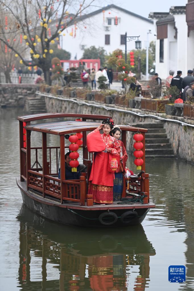 2月5日,游客在浙江省湖州市吳興區八里店鎮潞村乘船巡游。