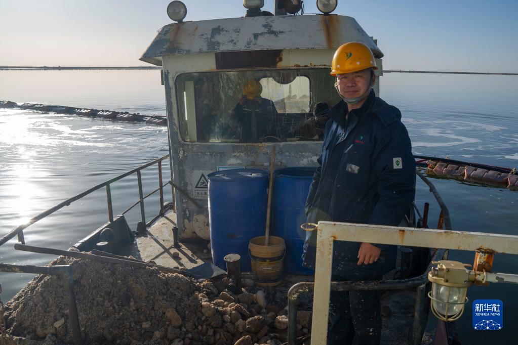 2月2日,賀連福(右)與同事駕駛工作船運輸鹵水結晶。