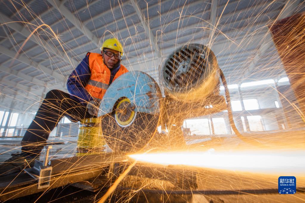 2月5日,在中建三局三公司承建的湖北省孝感楚能新能源項目工地,工人在切割角鋼。