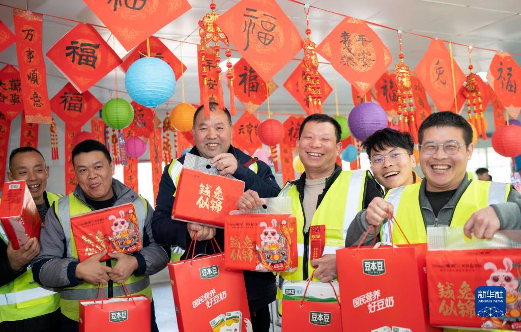 2月5日,在中建三局三公司平頂山項目部,工友們展示猜燈謎的獎品。