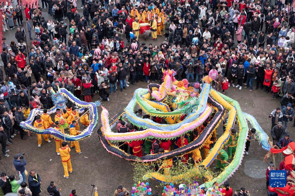 2月5日,貴州省錦屏縣隆里古城的舞龍隊在表演“花臉龍”(無(wú)人機照片)。