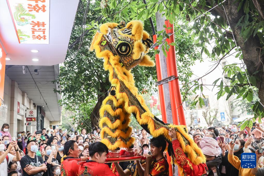 2月5日,游客在??谑协偵絽^府城觀(guān)看舞獅表演。
