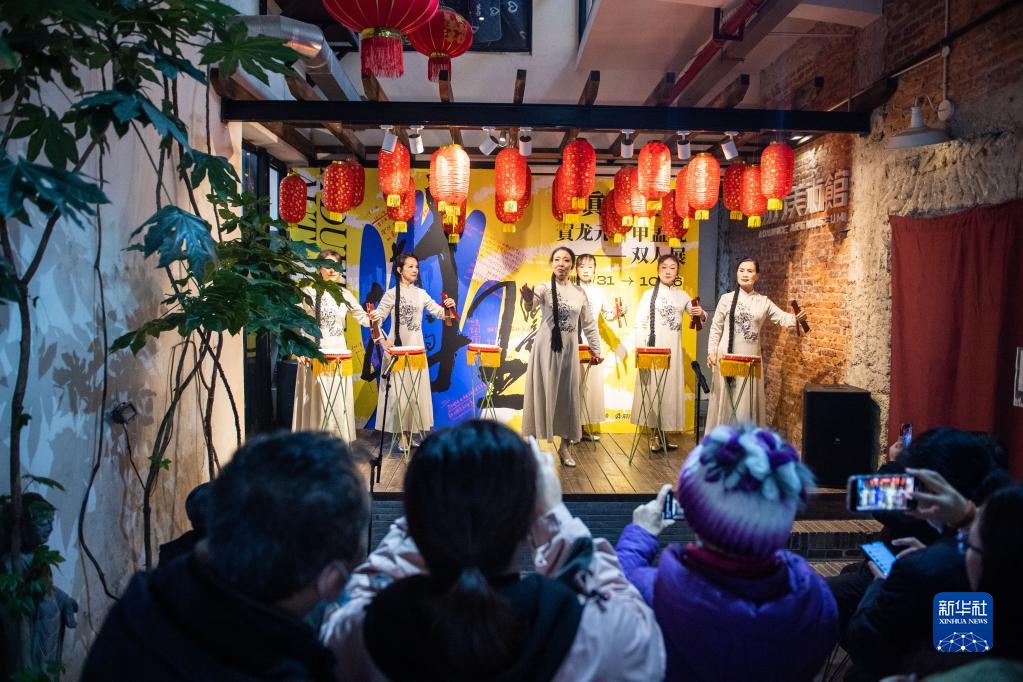 2月5日,在湖南省長(cháng)沙市天心區太平老街前行美術(shù)館,市民觀(guān)看天心區文化館工作人員演出的長(cháng)沙大鼓《氣貫長(cháng)虹耀乾坤》。