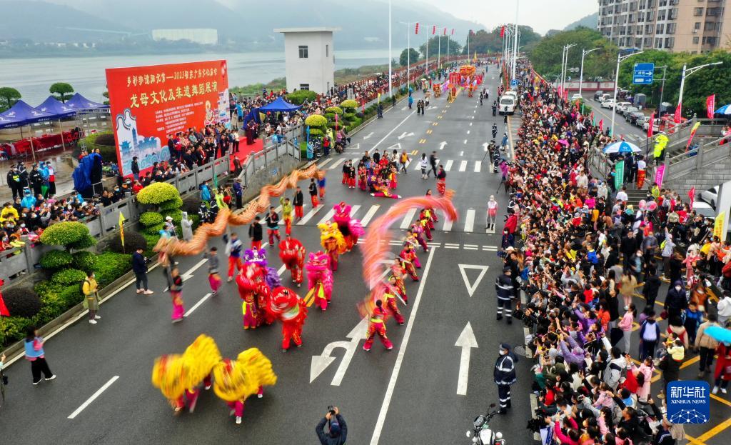 2月5日,在廣東肇慶廣府文化廟會(huì )現場(chǎng),人們在觀(guān)看舞龍舞獅表演(無(wú)人機照片)。