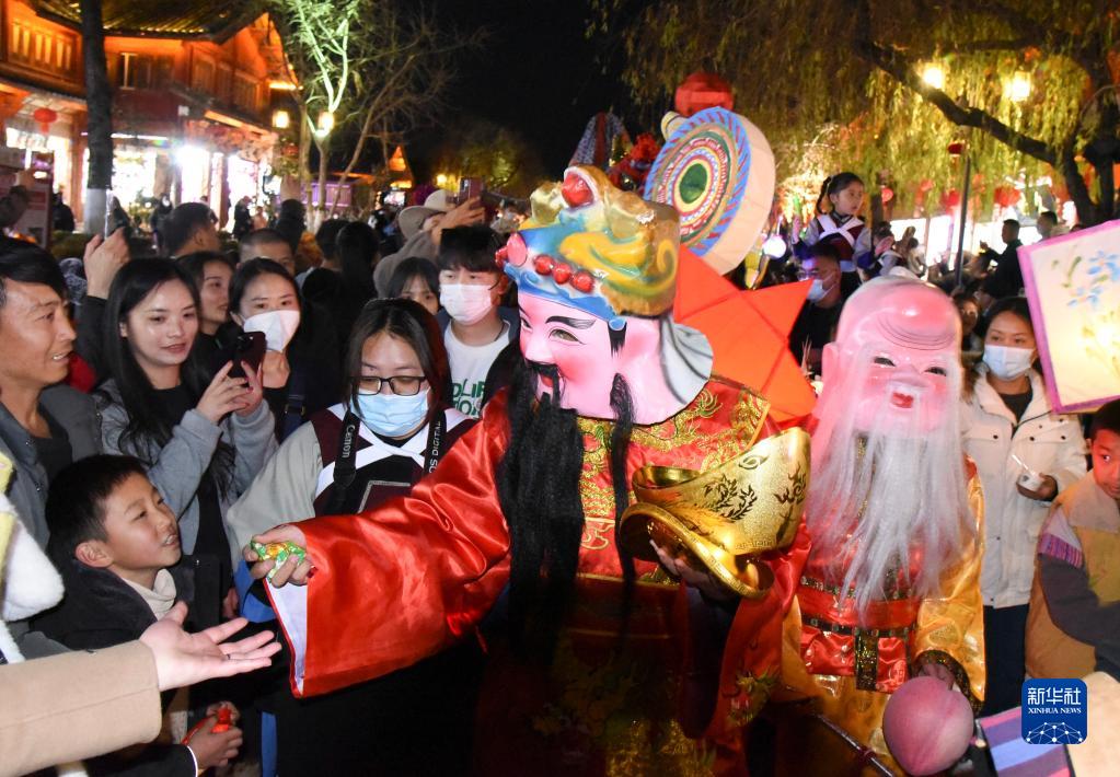 2月5日,在云南省麗江古城的元宵提燈會(huì )上,“財神爺”在給游客發(fā)糖。