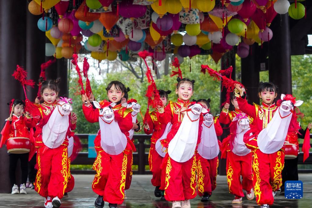 2月6日,浙江省湖州市長(cháng)興縣陳武帝故宮,長(cháng)興開(kāi)發(fā)區中心幼兒園的孩子們在體驗非遺馬燈舞蹈。