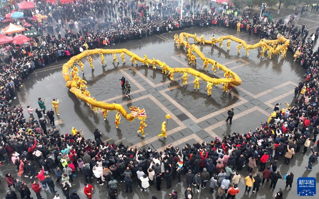 2月6日,人們在全椒縣太平文化廣場(chǎng)觀(guān)看舞龍表演(無(wú)人機照片)。