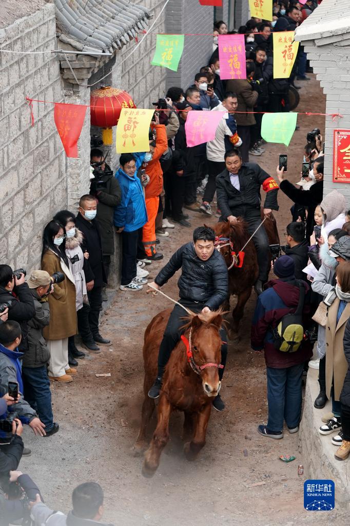 2月6日,平定縣下董寨村村民在表演“跑馬排”。