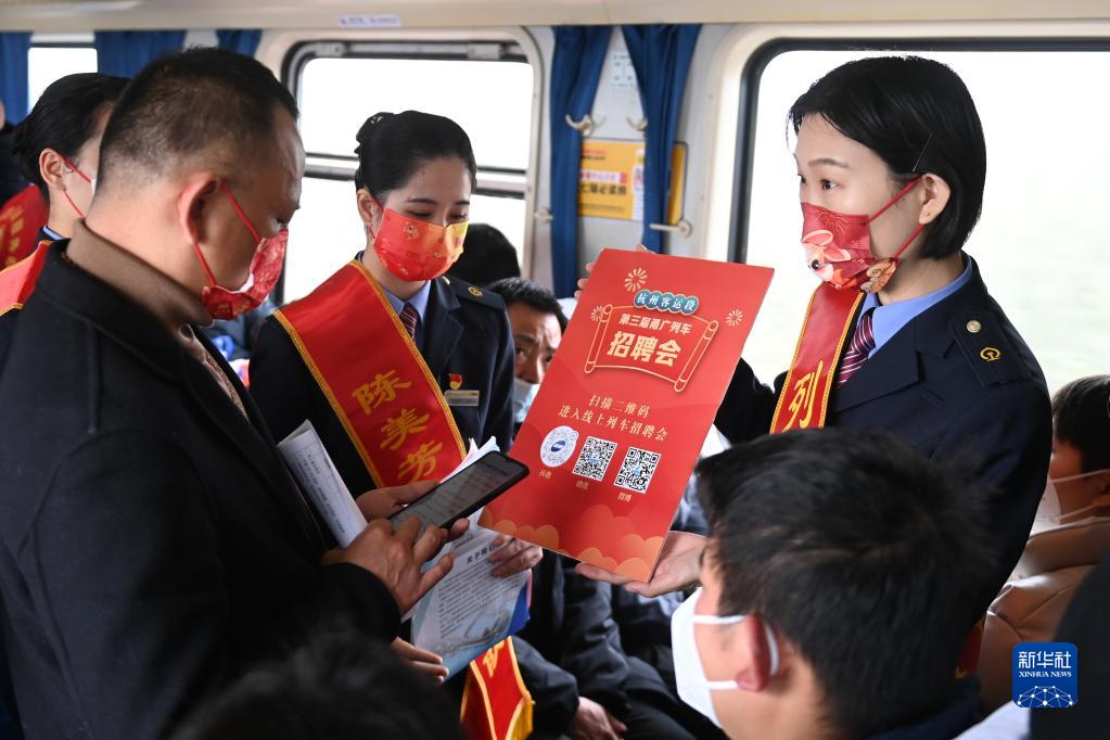 當日,中國鐵路上海局集團有限公司杭州客運段第三屆列車(chē)招聘會(huì )在由廣州開(kāi)往寧波的K210次列車(chē)上舉行,來(lái)自浙江的10家企業(yè)代表受邀來(lái)到列車(chē)上,與旅客面對面,為旅客提供暖心的就業(yè)服務(wù)。