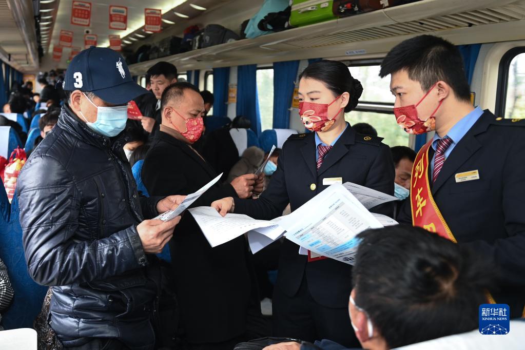 2月6日,在K210次列車(chē)上,杭州客運段乘務(wù)人員向旅客發(fā)放參與現場(chǎng)招聘的崗位信息。
