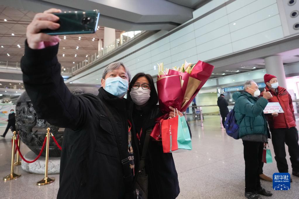 2月6日,內地與港澳人員往來(lái)全面恢復后,香港赴北京首個(gè)旅游團的游客在首都國際機場(chǎng)合影留念。