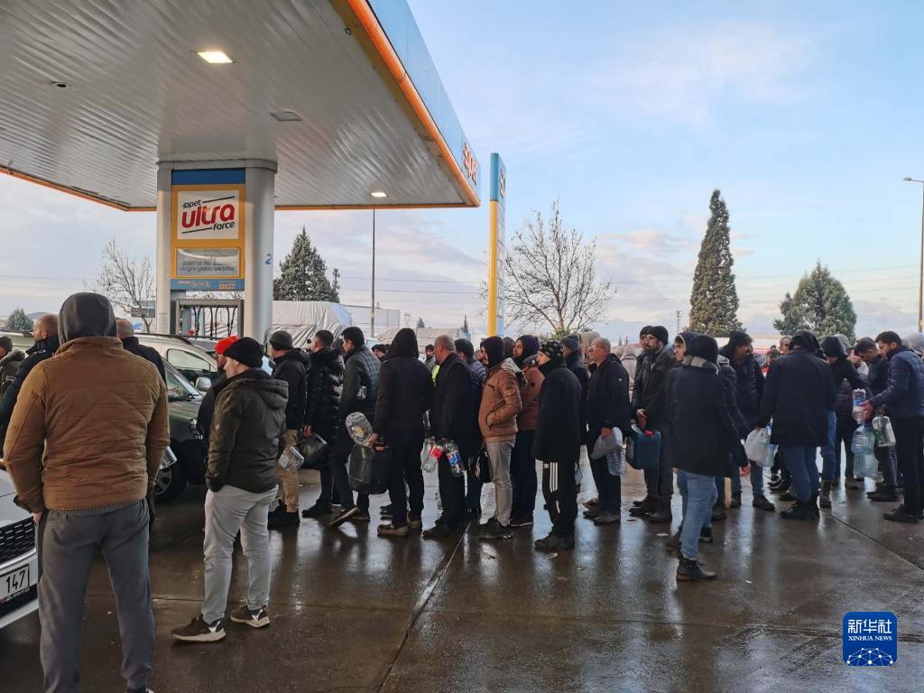 2月7日,人們在土耳其卡赫拉曼馬拉什排隊裝油。目前卡赫拉曼馬拉什大部分加油站都已關(guān)閉(手機照片)。