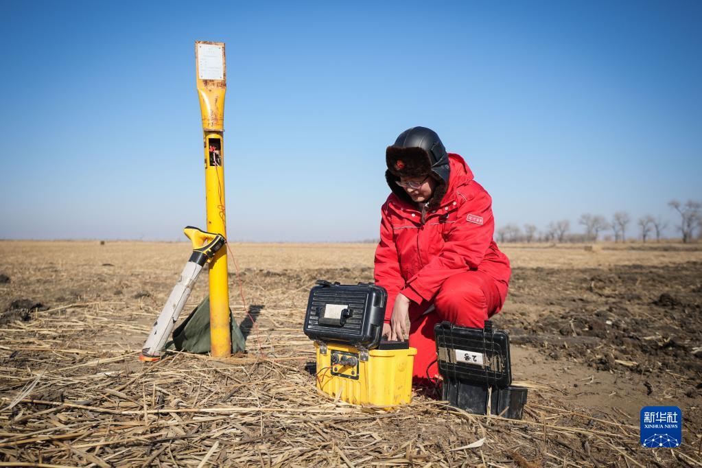 2月6日,中國石油遼河油田興隆臺輸氣分公司巡線(xiàn)工人在調試管道測量設備。